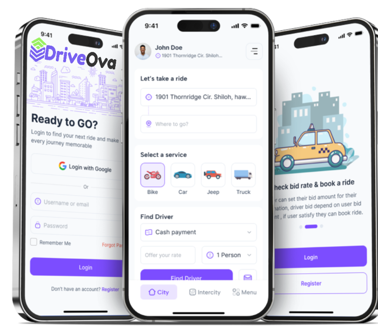 Riders enter their trip details, and drivers submit competitive bids. Riders can compare offers based on price and ratings.